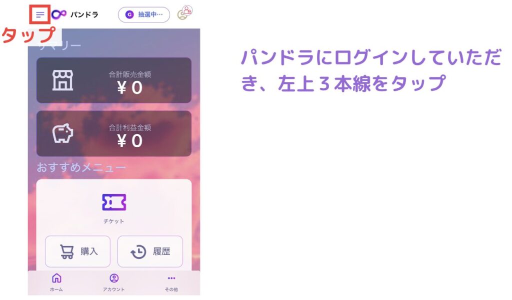 パンドラにログインしたらまづは左上の3本線をタップしメニューを開きます。