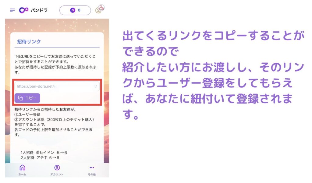 このリンクがあなたのアカウントに紐づくリンクなので、コピーして紹介したい方にお渡ししていただければ完了です。