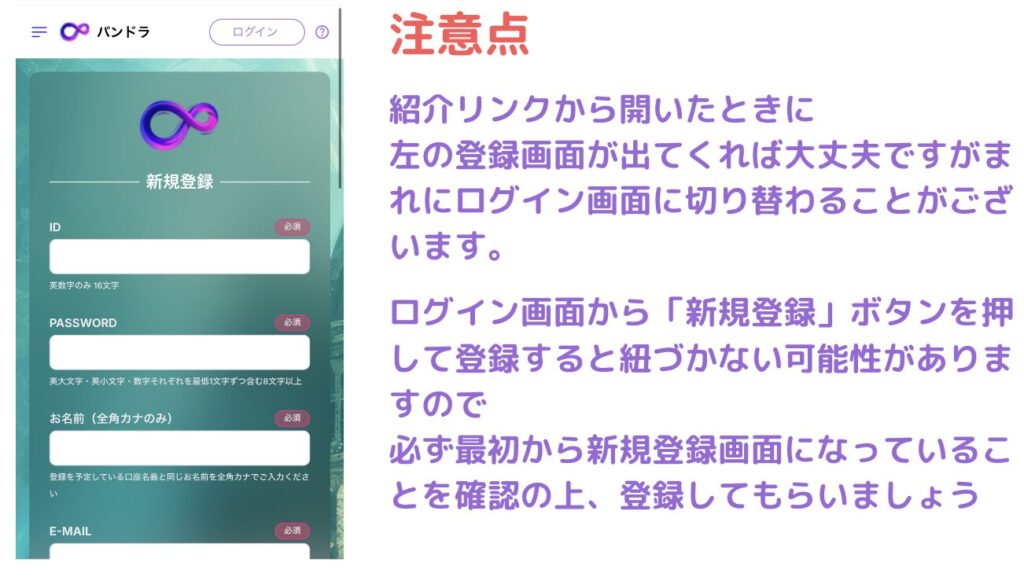※紹介リンクを開いた時に登録画面とは違う画面が出たり、一度閉じてしまって再度やり直そうとする時にリンクが紐付かなくなってしまう可能性もあるのでご注意ください。