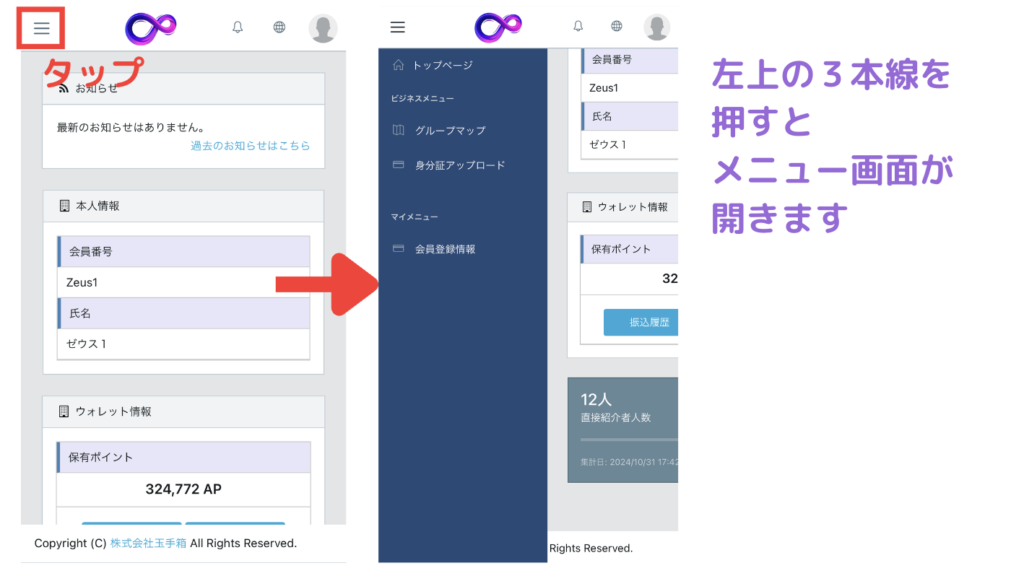 トップ画面にある保有ポイントより、「振込み申請」ボタンをタップします。