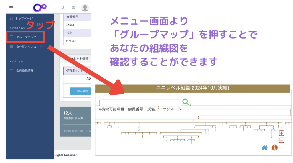 アフィリエイトページでは、報酬の受取申請だけでなく、ご自身の紹介したユーザーの組織図も確認することができます。