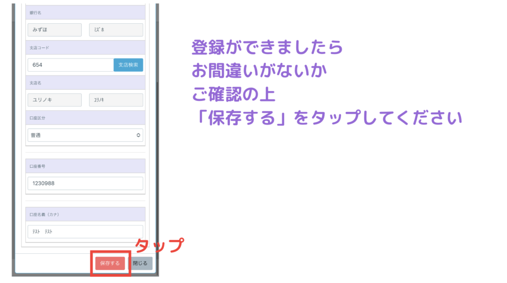 口座情報の登録には銀行コード・支店コードの番号にて検索となるため、あらかじめお調べいただいて登録をお願いいたします。
