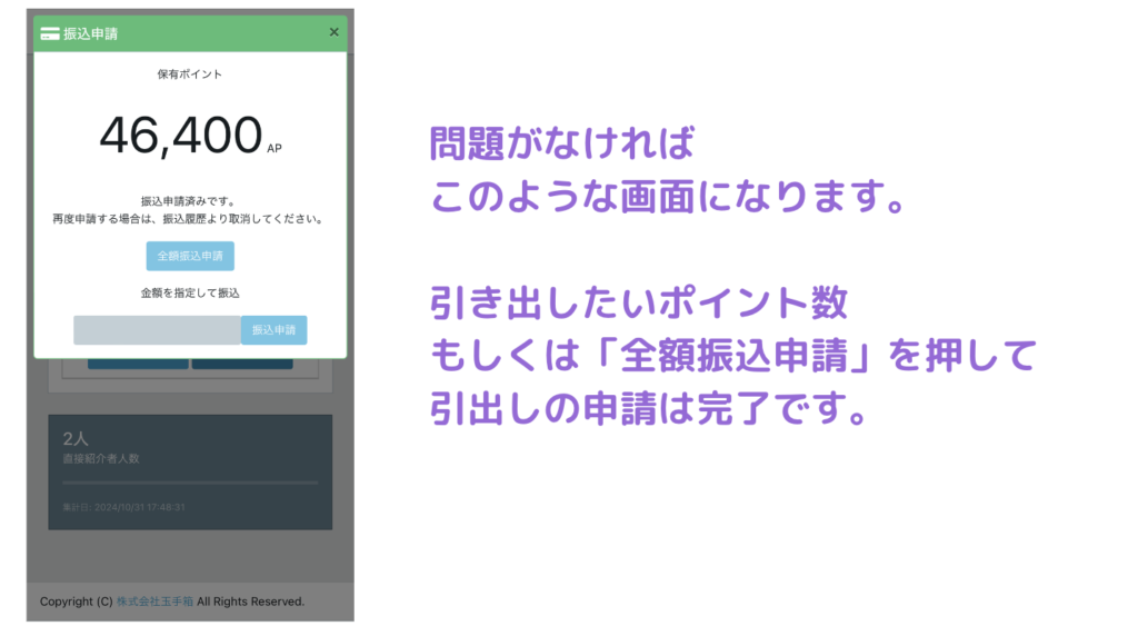 受取りたい金額を打ち込む、もしくは「全額振込申請」を押し、申請を完了することで報酬を受け取る作業は終了です。