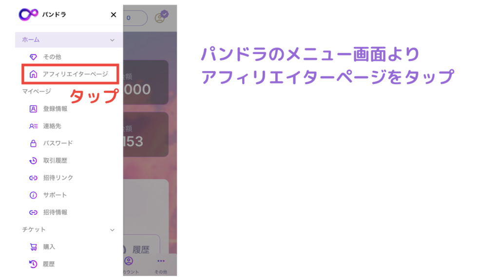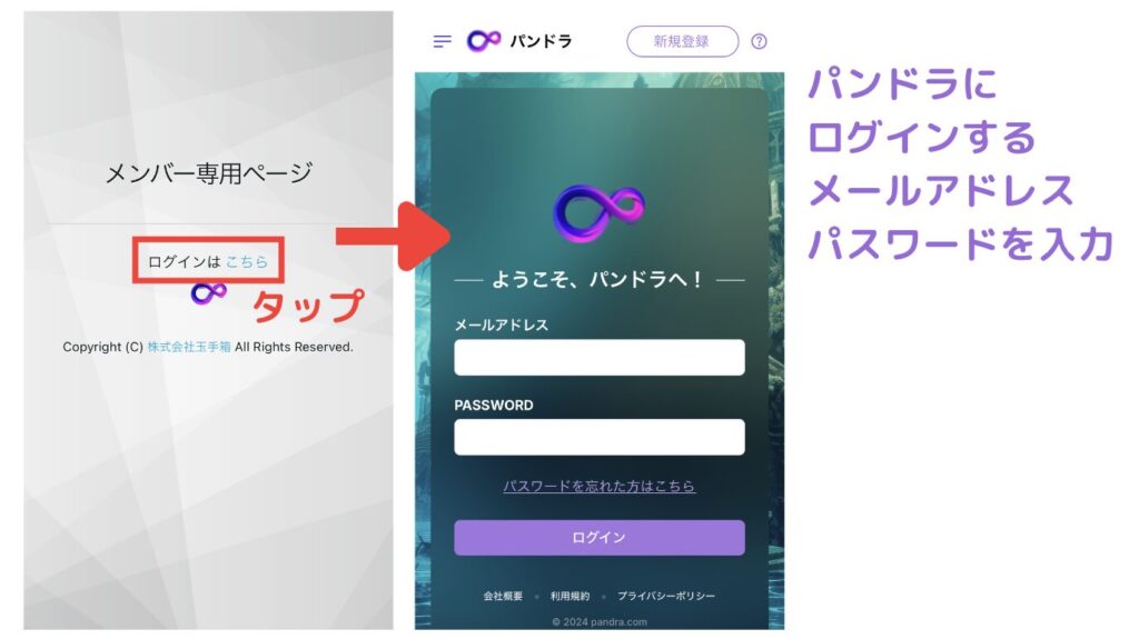 パンドラ内からアフィリエイトページに飛び、ご自身の登録メールアドレス・パスワードにてログインすることが可能です。